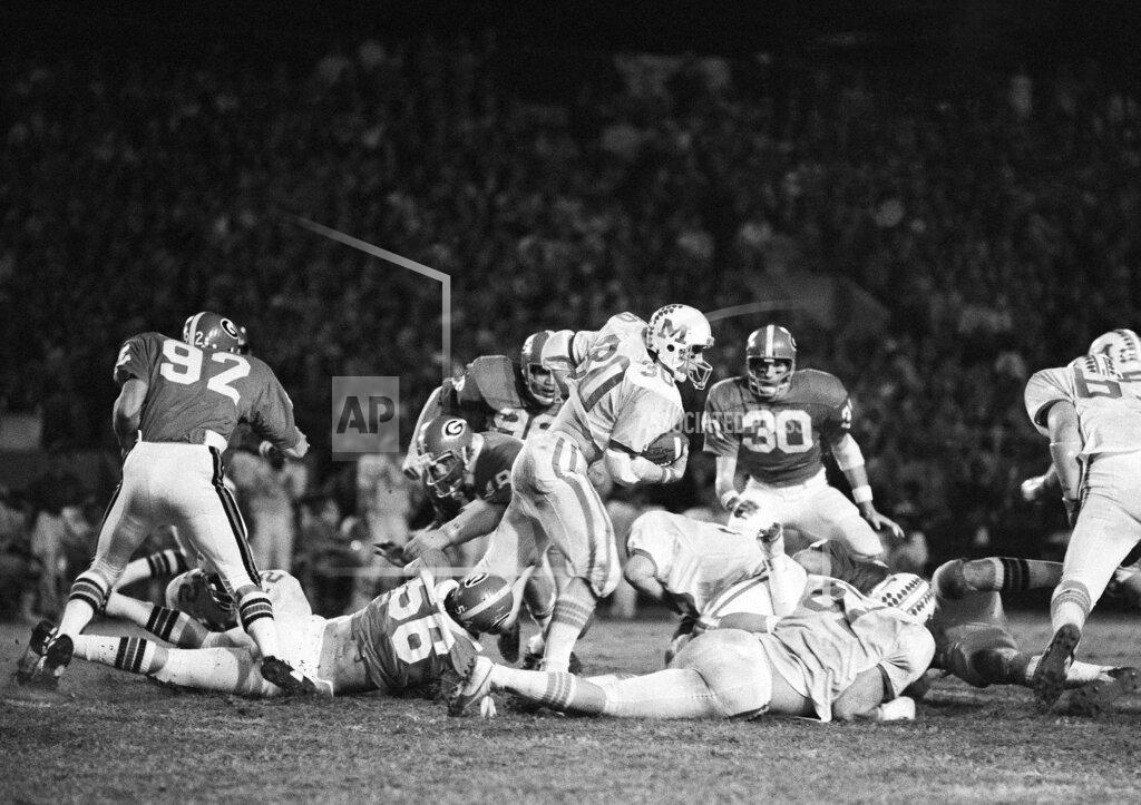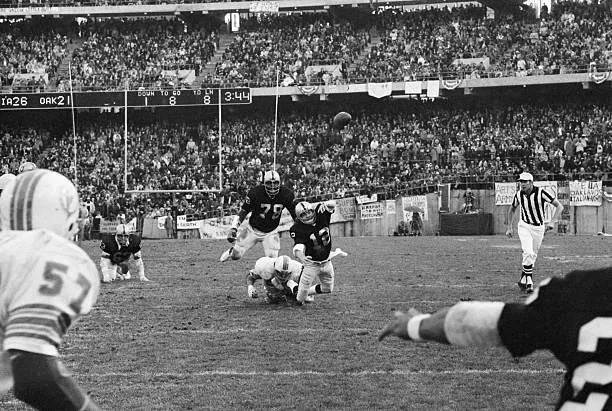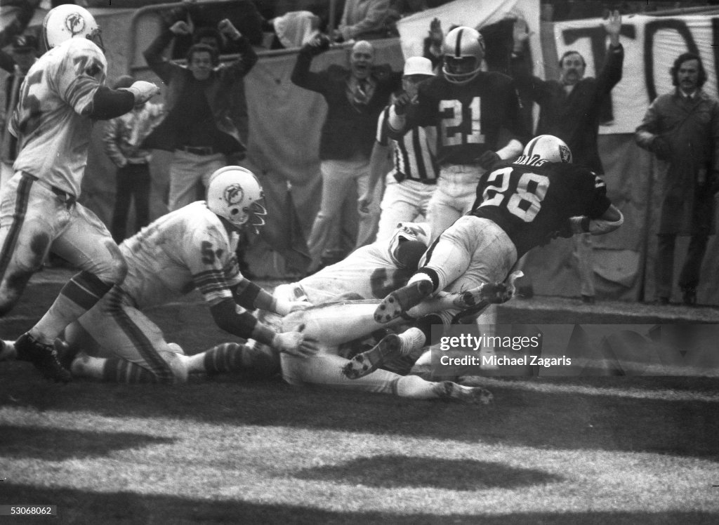 The Oakland Raiders defeated the Miami Dolphins, 28–26, in the AFC playoff opener. In a play that became known as the “Sea of Hands,” the Raiders’ Clarence Davis somehow caught the winning touchdown pass with 24 seconds left in the game among “the sea of hands” of three Dolphins defenders. The game began when rookie receiver Nat Moore returned the opening kickoff 89 yards for a Miami touchdown. Dick Anderson then intercepted a pass from Ken Stabler, but fellow safety Jake Scott was hurt on the play and would miss the rest of the game. Oakland’s defense made a stand in their own territory to force a punt. Later on, the Raiders tied the game with Stabler’s 31-yard touchdown pass to Charlie Smith. But with 1:01 left in the half, Miami’s Garo Yepremian kicked a 33-yard field goal to put the Dolphins back in the lead. The Raiders scored on their opening drive of the third quarter with Stabler’s 13-yard touchdown pass to Fred Biletnikoff, who hauled in the ball with one arm along the right sideline and barely tap his feet in bounds through tight coverage by cornerback Tim Foley, giving them a 14–10 lead. Aided by a 29-yard pass interference penalty against the Raiders on third down, Miami struck back with Bob Griese’s 16-yard touchdown pass to Paul Warfield. But Oakland lineman Bubba Smith blocked the extra point attempt, keeping the Miami lead at just 2 points, 16–14.