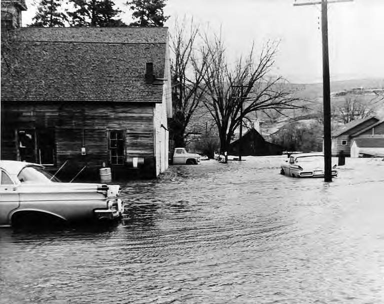 In Oregon the Willamette River continued to rise over the flood level, threatening about 4,200 homes in the Salem suburb of Keizer, where evacuations began today. State officials warned that food was in short supply in some areas and asked residents to buy no more than was absolutely necessary. Officers in Cassia County, Idaho, said the Dewey Dam had broken near Declo and was threatening the town with a 25‐foot wall of water. The earthfill dam is six miles east of the town of Marsh Creek. The town has a population of 700 persons. All are being evacuated. High waters and slides marooned two passenger trains, dozens of bridges were washed away and road and railway travel in many portions of the three states was at a standstill. A Coast Guard helicopter that disappeared last night during a rescue mission on the northern California coast was sighted late today near U.S. Highway 101, 20 miles north of Eureka. There was no immediate word on the fate of the three crewmen.