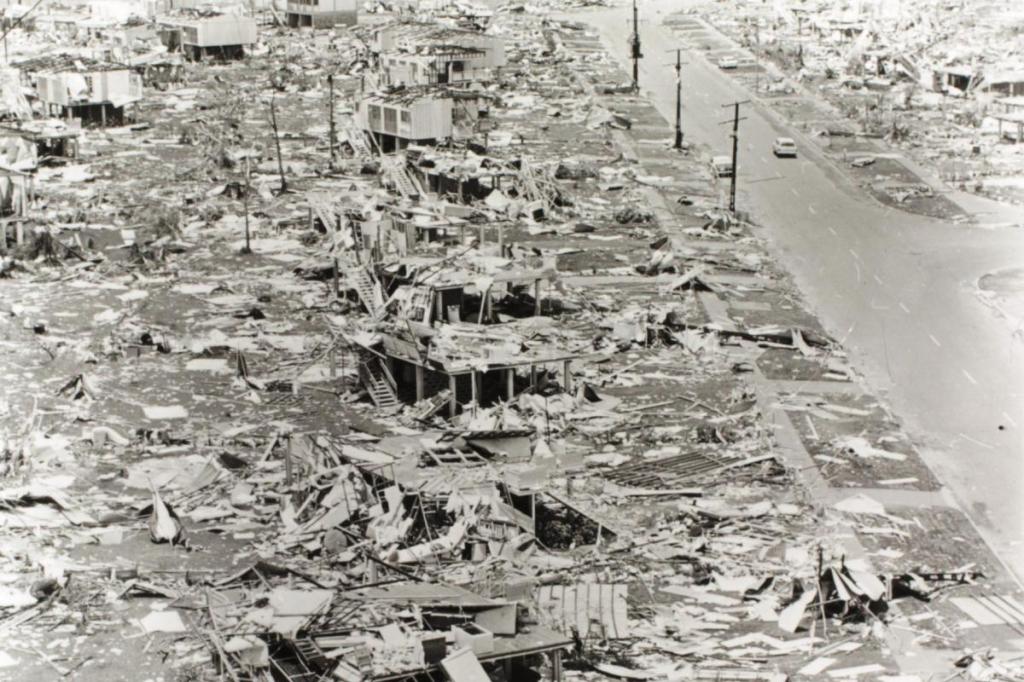 The city of Darwin in Australia was struck by Cyclone Tracy at 10:00 pm local time. Over the next eight hours, the storm would destroy more than 70% of commercial buildings and 80% of houses, leaving 25,000 of the city’s 47,000 residents homeless. Tracy killed 66 people and caused $837 million in damage (1974 AUD, about $7.69 billion in 2022, approximately US$5.2 billion). The last radio report from Darwin, a port city and capital of the remote northern territory, said that the city, which has a population of about 35,000, had been “completely devastated.” The roofs of buildings were blown off, power lines were brought down and hundreds of windows were smashed. The cyclone, designated Tracy, which first hit the area last night, brought torrential rain. All normal communications with the city were cut off and the only contact was through Australian Navy ships. Five vessels, including a naval patrol boat, went aground in Darwin harbor. One man drowned when a fishing boat, heading for the safety of the shore, capsized. After 10:00 p.m. ACST, damage became severe, with wind gusts reaching 217 km/h (117 kn; 135 mph) before instruments failed. The anemometer in Darwin Airport control tower had its needle bent in half by the strength of the gusts.