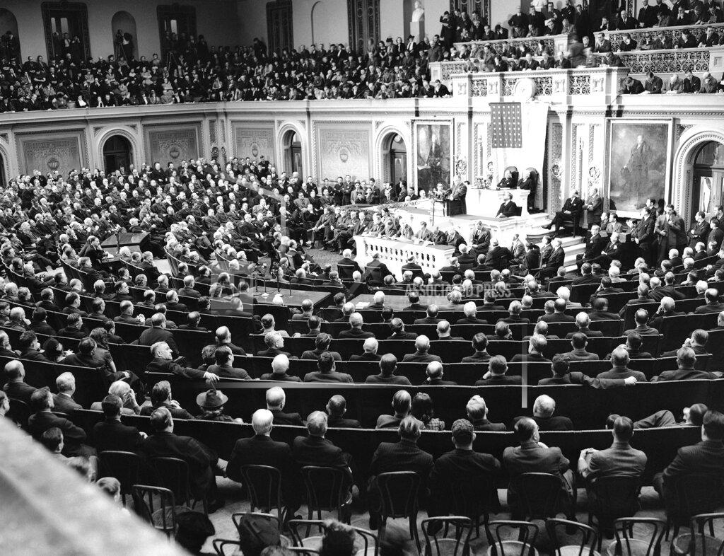 U.S. President Franklin D. Roosevelt gave the 1940 State of the Union Address to Congress tonight, saying, “There is a vast difference between keeping out of war and pretending that this war is none of our business… In previous messages to the Congress I have repeatedly warned that, whether we like it or not, the daily lives of American citizens will, of necessity, feel the shock of events on other continents. This is no longer mere theory; because it has been definitely proved to us by the facts of yesterday and today,” the president said. He asked the Congress to approve increased national defense spending “based not on panic but on common sense” and “to levy sufficient additional taxes” to help pay for it. Roosevelt asked Congress to provide $1.8 billion for national defense, new appropriations of almost $1.2 billion, and the development of an annual production program of 50,000 aircraft. A stronger U.S. national defense financed by new taxes, a constitution of new deal policies, and a national unity reinforced by “calmness, tolerance and cooperative wisdom,” was urged upon Congress today by President Roosevelt, in a message delivered to the newly convened session.