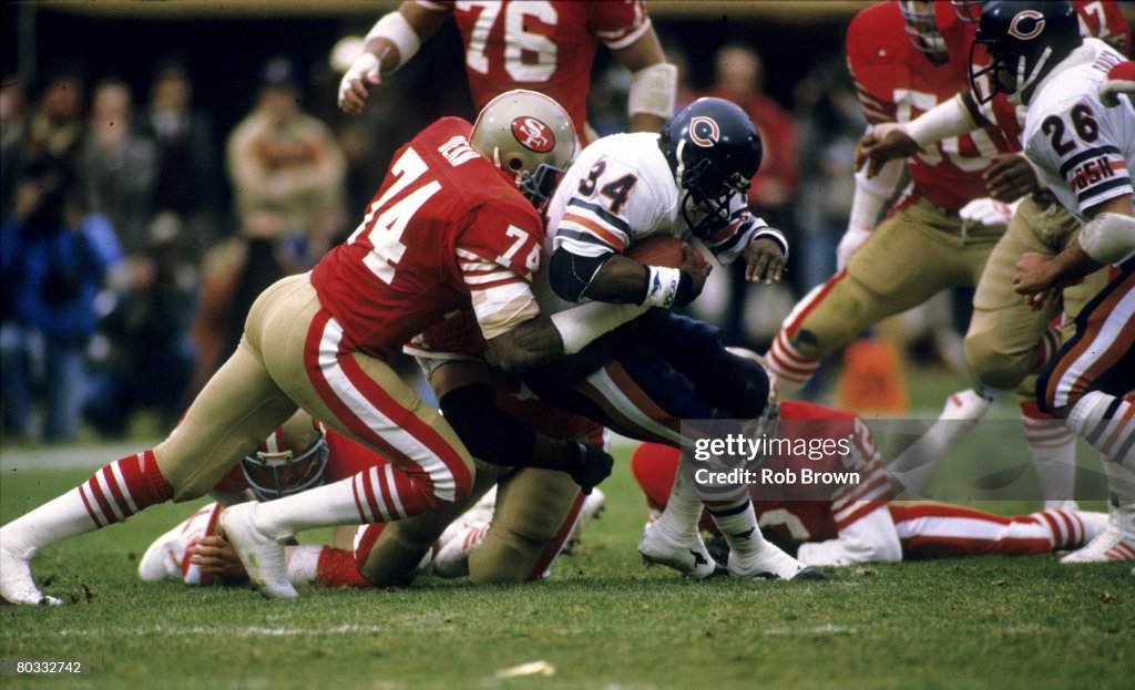 Neither team played particularly well in the first half. Chicago took the opening kickoff and moved the ball 54 yards, 29 on carries by Walter Payton. But the drive stalled at the 49ers 23 and ended with no points when Bob Thomas missed a 41-yard field goal attempt. San Francisco then drove to the Chicago 2-yard line in 8 plays, but quarterback Joe Montana fumbled the snap on third down and had to dive on the ball. After that, Ray Wersching kicked a 21-yard field goal to make the score 3-0. 49ers safety Dwight Hicks gave the team a great chance to increase their lead more by intercepting a pass from Fuller in Chicago territory. San Francisco made it all the way to the 2-yard line again, but this time they did not even get a field goal as Montana was intercepted in the end zone by safety Gary Fencik. A 66-yard drive to the Bears 4-yard set up Wersching’s second field goal in the second quarter, giving the 49ers a 6-0 lead. Meanwhile, the Bears offense would go the entire period without gaining a first down. Fencik intercepted another pass from Montana, but Chicago could not do anything with the turnover opportunity.
