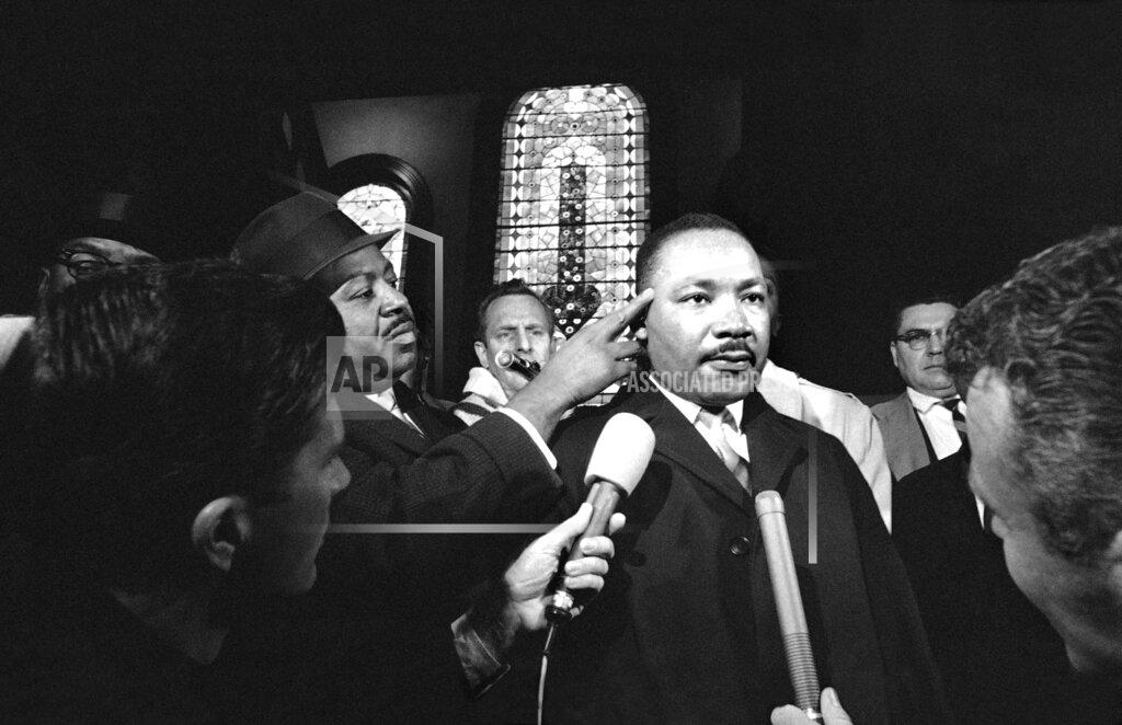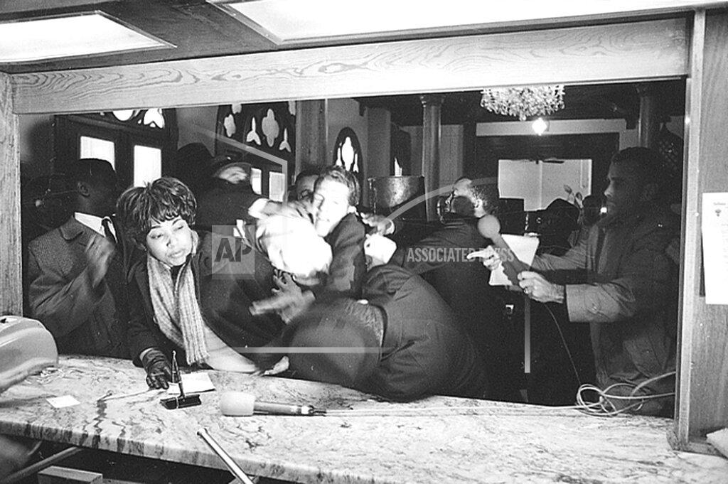 The Rev. Dr. Martin Luther King Jr. was punched and kicked by a white man today in Selma, Alabama while he was registering as the first Black guest of a hotel built more than a century ago by slave labor. The attack, which came without warning, set off a brief disturbance in which a lamp was overturned and a crystal chandelier was set to tinkling in the lobby of the Hotel Albert, a magnificent old building copied after the Doge’s Palace in Venice. The civil rights leader, here to lead demonstrations against segregation and voter discrimination, was standing at the registration desk surrounded by 11 other Blacks and a group of reporters, cameramen and policemen. Suddenly a tall gaunt man who had cofronted Dr. King a few minutes earlier at the Dallas County Courthouse wormed his way through the crowd and said: “I want to talk to you.” Then he drew back and struck Dr. King twice on the right temple. John Lewis, chairman of the Student Nonviolent Coordinating Committee, pinned the attacker’s arms to his sides. The man then kicked Dr. King twice, catching him lightly on the thigh near the groin, and the group of struggling men surged across the red carpet.