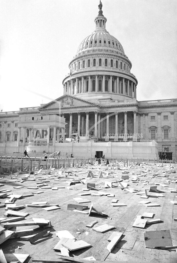 The Inaugural parade viewing stands in front of the White House on Pennsylvania Avenue were being dismantled today, and yesterday’s festive spirit was replaced with a down-to-business mood. The hour-and-45-minute meeting with the bipartisan leadership of Congress was apparently arranged late last night, possibly while the President was touring five inaugural balls. The White House press secretary, George E. Reedy, said there was “no crisis whatsoever.” He said it was a “very frank and thorough discussion of the international situation… At the beginning of his term he is planning to make every effort to keep them [the leaders] fully informed on developments throughout the world,” Mr. Reedy said.