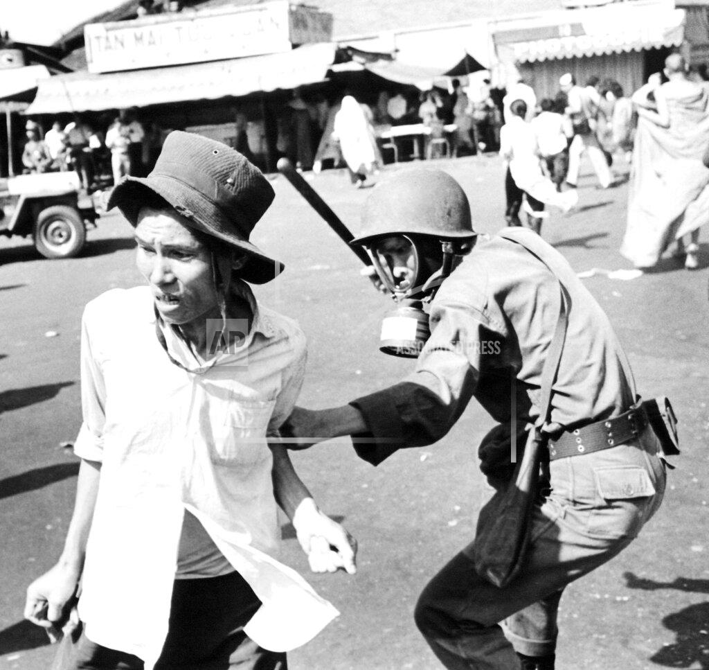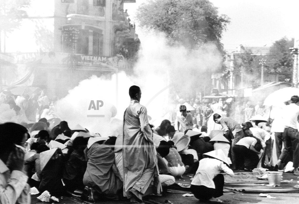 Trouble arose two blocks away. A wave of shouting Buddhist youths attacked and stoned cordons of combat policemen. The rioters, dispersed with tear gas and clubs, reassembled and marched on the United States Information Service’s Abraham Lincoln Library, four blocks from the embassy. There they smashed doors and windows. At the embassy a Buddhist spokesman declared over a loudspeaker that the Government had piled repression after repression upon Buddhism and that “we have no choice but to show our grievances publicly.” A group of Buddhist chaplains of the South Vietnamese Army drove into the crowd and tried to push through a barbed wire barricade. Soldiers trained submachine guns on their windshield, and the chaplains backed away. Paratroops finally donned gas masks and broke up the demonstration with tear gas and clubs. Several dozen demonstrators were injured.