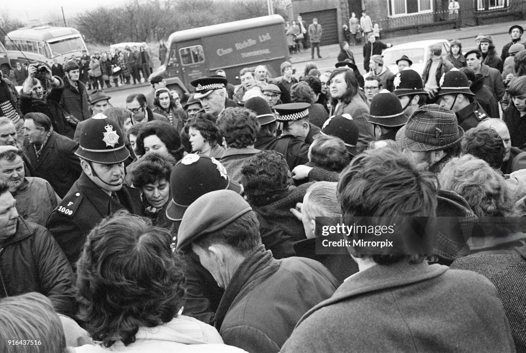 1975 Miners Strike, Coal Miners Pickets clash with NCB Office Workers outside the Coal Board Office in Tondu, Mid Glamorgan, Wales, 26th January 1972. (Photo by Ron Harding/Mirrorpix/Getty Images)