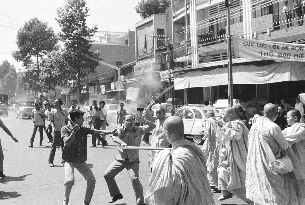 Scuffles broke out between the Saigon police and a group of Buddhist nuns today after a convention held by political opponents of President Nguyễn Văn Thiệu. Opposition leaders had urged the United States to end military aid to the Thiệu Government and called for the President’s ouster. Twenty nuns left the convention at the Ấn Quang Pagoda in Saigon and marched down the street chanting anti‐government slogans. Witnesses said they were confronted by a group of uniformed and secret policemen and that in the melee four nuns were injured, one seriously. The leader of the nuns, Huỳnh Liên, asserted that policemen threw rocks at the group and struck several of them with sticks and a metal object. The seriously injured nun was struck on the head, but was able to walk with assistance. The nuns have demonstrated several times in Saigon since September, touching off occasional clashes with the police. Since October, the pagoda has been surrounded by the police, but they have used various, ruses to leave and conduct demonstrations. About 300 persons attended the political convention, called to mark the second anniversary of the Paris peace agreement, which was supposed to end the war in Vietnam.
