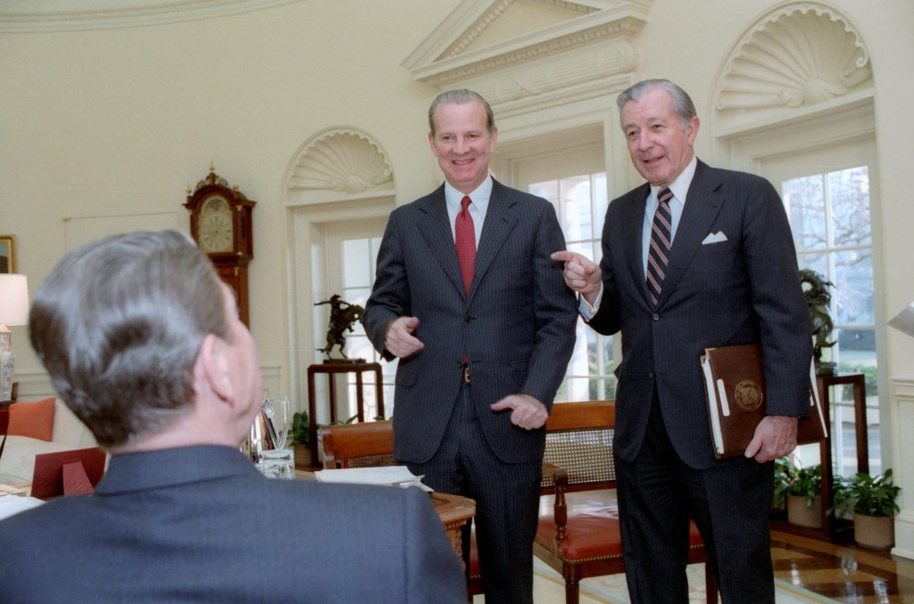 President Reagan attends a National Security Council meeting to discuss the Soviet violations of the SALT II treaty.