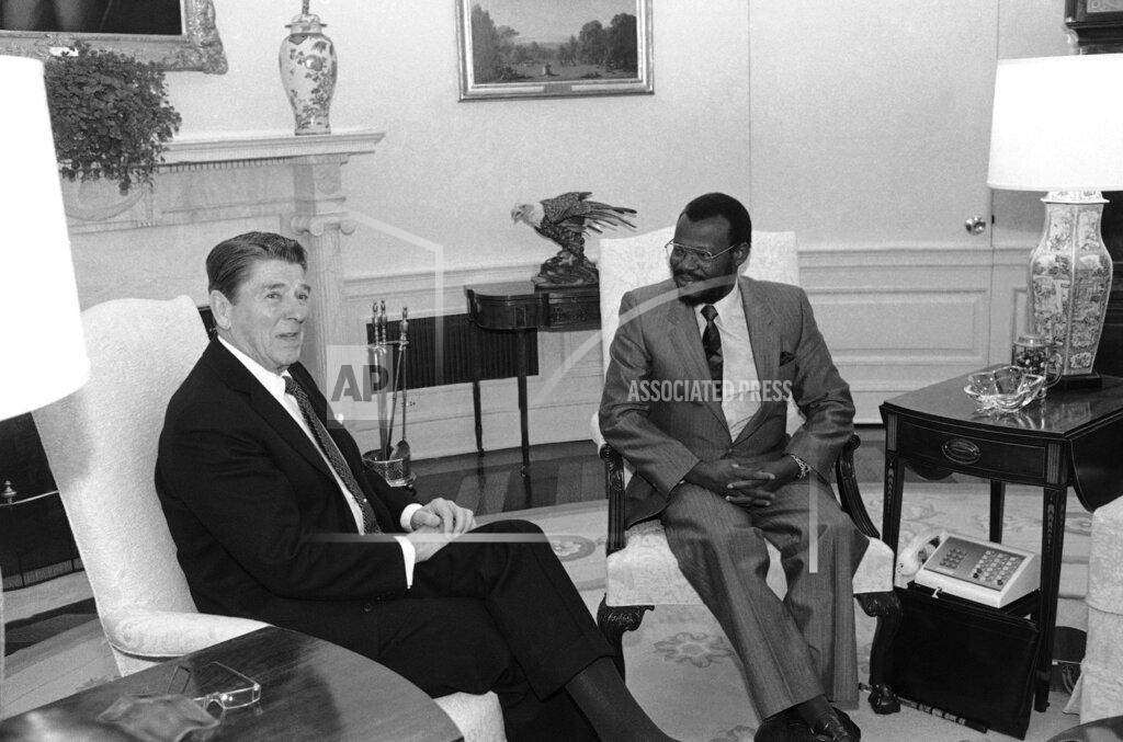 President Reagan meets with Zulu Chief of South Africa Gatsha Buthelezi. A key South African tribal chief and American leaders of the protest movement against apartheid differed sharply today over the issue of economic sanctions against the Pretoria Government. The remarks, made separately, came after the chief, Mangosuthu G. Buthelezi, met with President Reagan at the White House. Mr. Buthelezi, emerging from the 25-minute session with Mr. Reagan, said he opposed economic sanctions, as does Mr. Reagan. Leaders of the protest movement favor such sanctions. Chief Buthelezi called economic sanctions a “double edged” knife that would hurt blacks in South Africa. “Economic sanctions are a stick I think people want to use to rap the white South Africans or the Government over the knuckles,” he said. “My people would actually suffer more if it were to apply than the people who are oppressing us.”