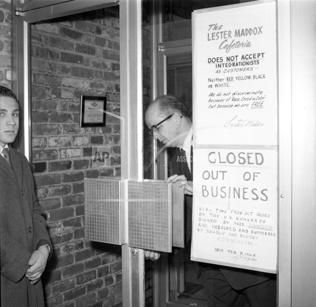 Lester Maddox closed his popular Pickrick Restaurant in Atlanta, one day after he had begrudgingly announced that he would relent to a court order and serve African-American customers, rather than face a daily $200 fine for contempt of court. At noon, when a young Black man named Jack Googer arrived to be the first customer, Maddox announced that he was closing the business. “I cannot betray my vow to my God” (to not serve Black customers), he told reporters. “Dollars are unimportant to me.” Maddox then placed a sign on the door, announcing that the Pickrick was “out of business, resulting from an act passed by the U.S. Congress, signed by President Johnson and inspired and supported by deadly and bloody Communism.”