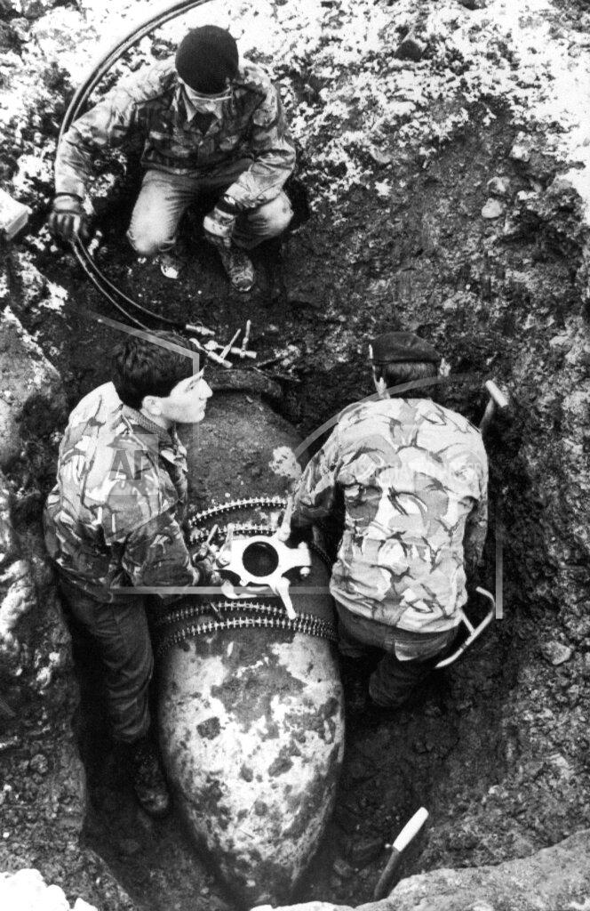 British Army bomb experts today defused a one-ton bomb — one of the biggest dropped on England during World War II — but the police said it was still unstable and posed a threat to homes in the area. About 200 families were evacuated Friday night from their homes, and the police sealed off the area. The bomb was discovered by Barry Hoult, 47 years old, who was driving a mechanical digger and said he made several attempts to scoop it up before he realized what it was. “There was a bump and I thought it was a big stone or an old pipe,” Mr. Hoult said. “I kept driving away at it and then realized something was wrong.”