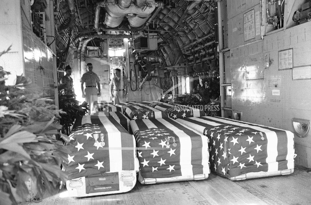 At Saigon Airport, nine dead American soldiers were honored and their bodies sent home. On the other side of the field crowds and a brass band welcomed the South Vietnamese pilots who bombed Communist North Vietnam yesterday.