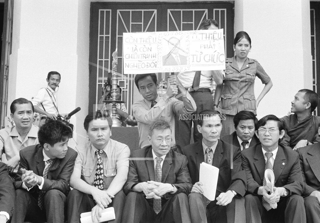 On the eve of Tết, the Vietnamese lunar new year, opposition deputies and religious figures gathered on the steps of the National Assembly building tonight and burned photographs of Presidegt Nguyễn Văn Thiệu. The deputies stood under flickering torches and shouted, “Down with country‐selling Thiệu!” Tết shoppers and strollers passed by and a government sound truck screeched popular music to drown out the demonstrators. Dương Văn Minh, the retired general who heads much or the opposition, put in a rare public appearance at the demonstration. The protest was prompted by Mr. Thiệu’s crackdown on the press. The government closed five opposition dailies and said it had arrested 18 journalists as “Communist infiltrators.”