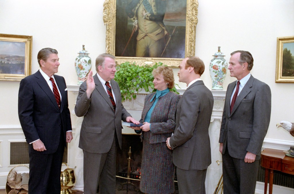 President Reagan attends a swearing-in ceremony for Edwin Meese as Attorney General. Edwin Meese 3d today assumed the office of Attorney General in a private swearing-in ceremony at the White House, then spent much of the day in briefings with top Justice Department officials. President Reagan and Vice President Bush attended the closed ceremony in the Oval Office. A public swearing-in ceremony is to be held the week of March 11, with Chief Justice Warren E. Burger administering the oath.