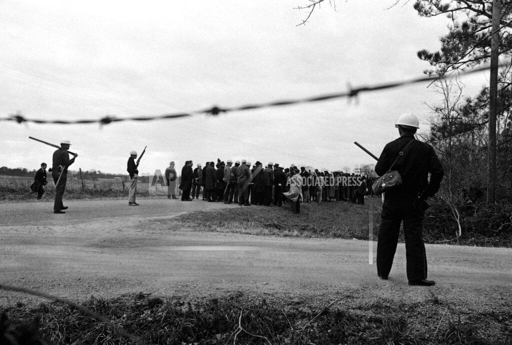 The Black marchers in Camden walked two and a half miles up Whisky Run Road this morning, headed for the Wilcox County Courthouse, before being stopped by the Mayor, two policemen and seven volunteer officers. The law enforcement men carried three shotguns and a number of pistols, nightsticks, and electric cattle prods. Twelve husky white men waited 25 yards back while Mayor F. R. Albritton and his party confronted Johnny Lee Jones, a 21-year-old Black from Selma, who was leading the march. Newsmen were kept out of earshot while Mr. Jones and Mayor Albritton talked.