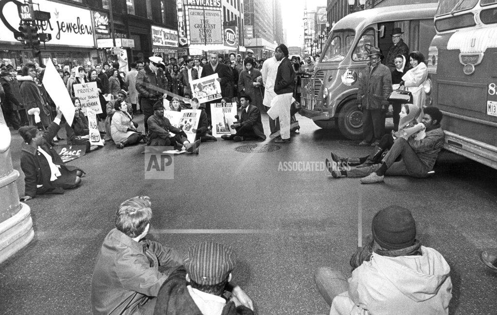 About 300 civil rights demonstrators sang, prayed and slept in a street tonight after the police halted their third attempt of the day to march on the Dallas County Courthouse. The first march of the day, led by six smiling nuns from St. Louis, had been halted by Mayor Joseph T. Smitherman and scores of policemen. The police also stopped the second march, attempted by a group of youngsters. “We’re going to stay here all night until the state troopers move aside and let us through,” the Rev. Ralph D. Abernathy said after the marchers were halted in their third attempt. He is an assistant to the Rev. Dr. Martin Luther King Jr., who has been heading the Black voter registration drive here.