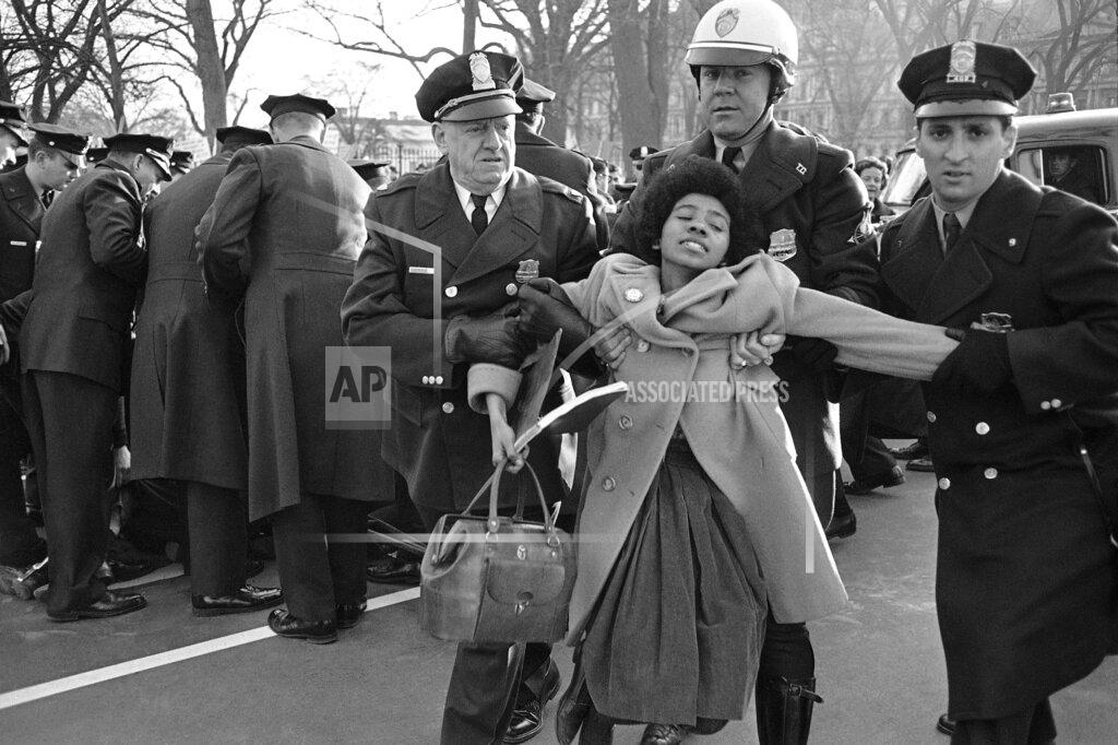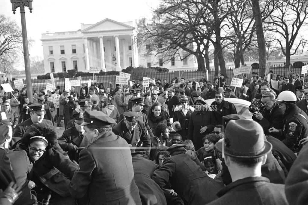 While he conferred with the ministers, hundreds of pickets marched along Pennsylvania Avenue in front of the White House. They chanted “Freedom, now,” sang “We Shall Overcome” and displayed posters such as one that read “Go All The Way, LBJ.” Late in the afternoon, some of the demonstrators lay down in the broad avenue, briefly bringing rush-hour traffic to a screaming halt. Four white women also sat down across a White House exit roadway. The four women and about two dozen demonstrators who had blocked Pennsylvania Avenue were hauled away by the police, but not without a hard struggle.