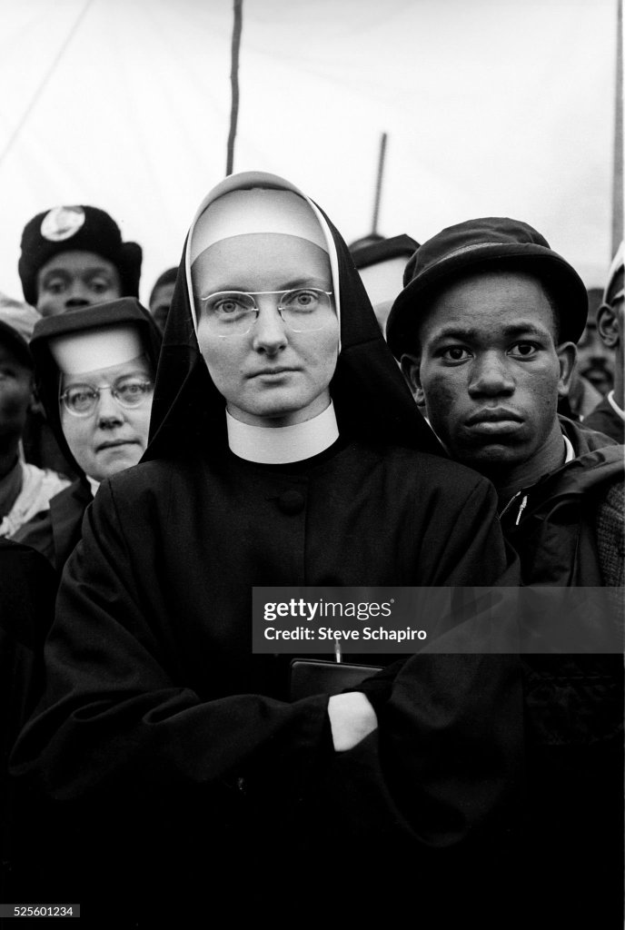 Behind them were 200 nuns of the order of the Sisters of Charity. They wore black habits. There was also a smaller group of Maryknoll sisters in gray habits. Some of them wore CORE buttons. Many of the marchers wore black arm bands in memory of the Rev. James J. Reeb, a white Unitarian minister from Boston who was beaten fatally in Selma last week, and in memory of Jimmie Lee Jackson, a Negro who was killed February 18 during an attack by the Alabama state police on a night march in Marion. The parade moved up Seventh Avenue to 145th Street, went east to Lenox Avenue, moved downtown on Lenox and finished back at the Theresa an hour and a half later. It was sunny and cool when the parade began; it was cold and nearly dusk when it ended. At least as many whites as Blacks marched in the procession, prompting a black-nationalist leader, James R. Lawson, who did not march, to comment that the demonstration was “not representative of the black man.”
