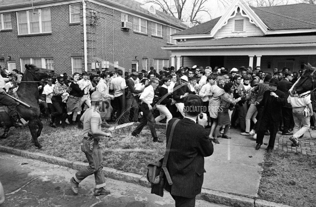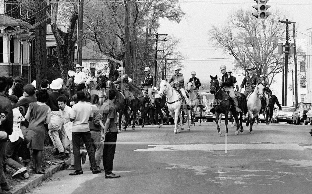 About 15 state and county policemen, some flailing with nightsticks and ropes, rode horses into 600 civil rights demonstrators in Montgomery today and sent the demonstrators screaming down a residential street. Eight persons were injured enough to be treated in hospitals, including Donald Hope, 38 years old, a white English teacher from Juniata College, at Huntingdon, Pennsylvania. He suffered scalp cuts. The police tactics in this Alabama capital so embarrassed local law-enforcement officials that they apologized publicly. attributing the clash to a “mixup.” Twelve hundred people crowded into a Black church tonight to protest the violence.