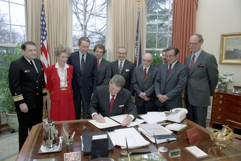 President Reagan attends a meeting with the Joint Chiefs of Staff to receive reports on the state of each branch of the military.