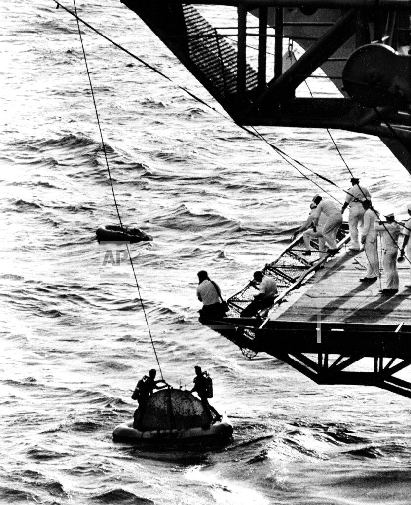 At 1:45, the Molly Brown was brought in for a landing as it passed over Hawaii, and splashed down in the Atlantic Ocean 33 minutes later at 2:18 p.m. Landing point accuracy was unexpectedly poor. The spacecraft landed about 60 nautical miles (110 km; 69 mi) from its nominal landing point. The crew had to remain afloat until a helicopter could transport them to the prime recovery ship, the aircraft carrier USS Intrepid (CV-11). Seasick and uncomfortably hot after the capsule had rocked during the wait, Grissom would note, “Gemini may be a good spacecraft, but she’s a lousy ship.” It was discovered after the flight ended that Young, who admitted that he did not eat his dehydrated lunch, had smuggled a corned beef sandwich on board. NASA reprimanded Young and Grissom because of the danger that floating breadcrumbs might have damaged the ship’s electronics.