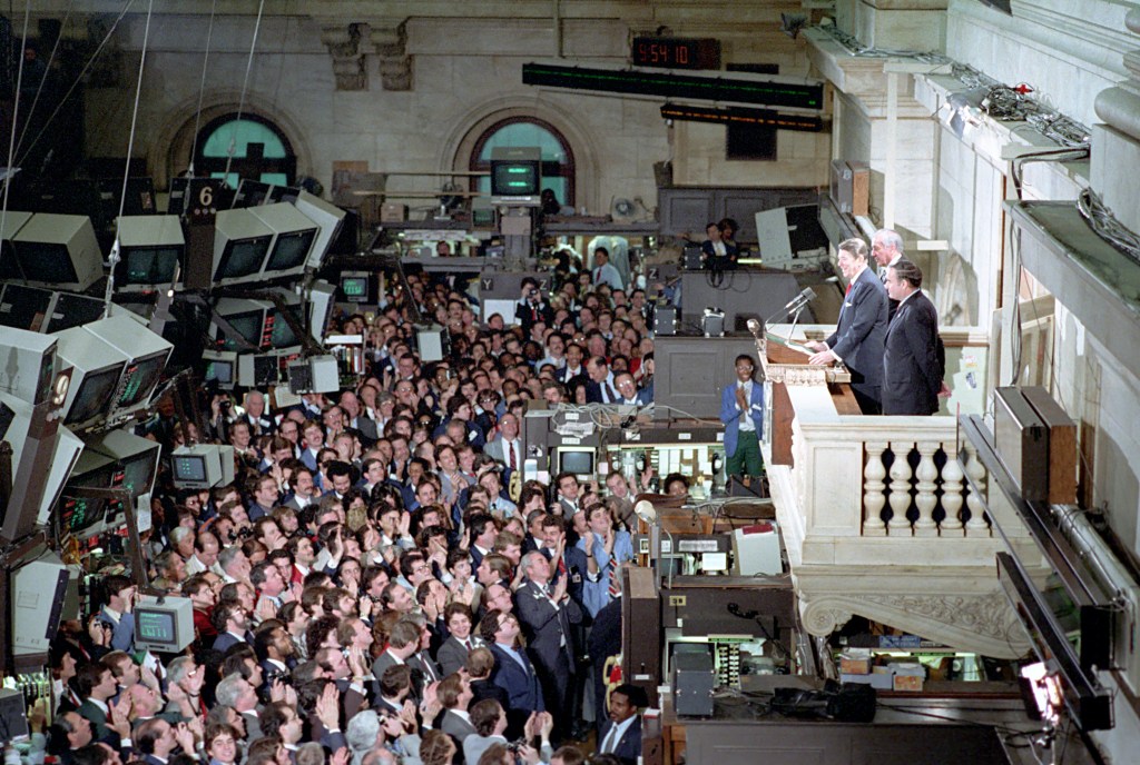 President Reagan travelled to New York City and opened the New York Stock Exchange.President Reagan, proclaiming the “age of the entrepreneur,” said that his Administration sought a radical shift in government policy marked by tax simplification and reduced Government spending. “We have lived through the age of big industry and the age of the giant corporation, but I believe that this is the age of the entrepreneur, the age of the individual,” Mr. Reagan told thousands of applauding students on the St. John’s University campus in Queens. “That’s where American prosperity is coming from now, and that’s where it’s going to come from in the future.” On a morning visit to New York City that took Mr. Reagan first to the floor of the New York Stock Exchange, where he received an ebullient reception from traders, and then to the St. John’s campus, Mr. Reagan coupled a blunt appeal for enactment of his legislative program with a broad message on the economic “revolution” he seeks to spur.