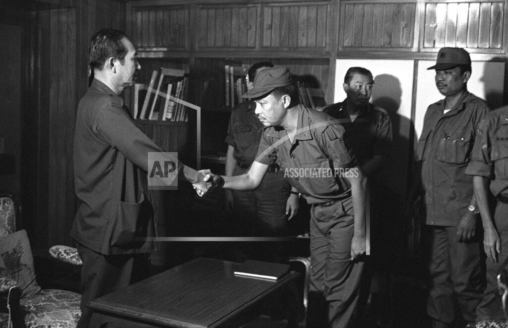 Clinging to the trappings of his offfice until his last moment on Cambodian soil, the head of state—who has been partly paralyzed since 1971—walked slowly in review past an honor guard and military band, followed by all the top ministers and generals in his Government. The helicopter carried him to Pochentong Airport, which has been under daily rocket attack for almost three months. There, he boarded a waiting plane that was to carry him on the first leg of a trip to Indonesia.