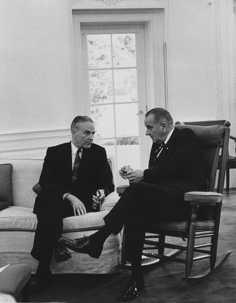Responding to questions from reporters — following meetings with Ambassador Maxwell Taylor, who is in Washington — President Johnson says, “I know of no far-reaching strategy that is being suggested or promulgated.” In fact, he is ready to authorize U.S. troops to go from defensive to offensive tactics in Vietnam. Ambassador Maxwell D. Taylor held the first of several meetings with President Johnson today to present what he called some “more definitive proposals” for United States operations in Vietnam.