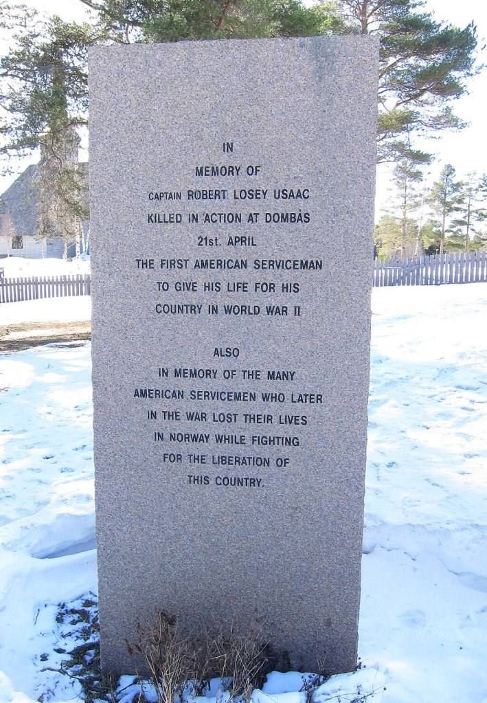 U.S. Minister to Sweden Frederick A. Sterling ordered Naval Attaché Lieutenant Commander Ole E. Hagen to Norway to retrieve Losey’s remains. Losey’s remains are buried next to those of his mother, in the West Point Cemetery. The citizens of Dombås erected a monument in Losey’s honor in 1987, with the following inscription: “In memory of Captain Robert Losey, USAAC, killed in action at Dombås 21th [sic] April; The first American serviceman to give his life for his country in World War II.”
