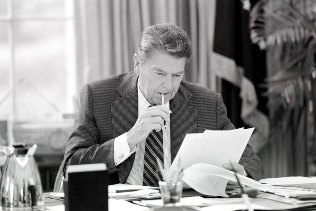President Reagan attends a National Security Council meeting to discuss the situation in Central America.