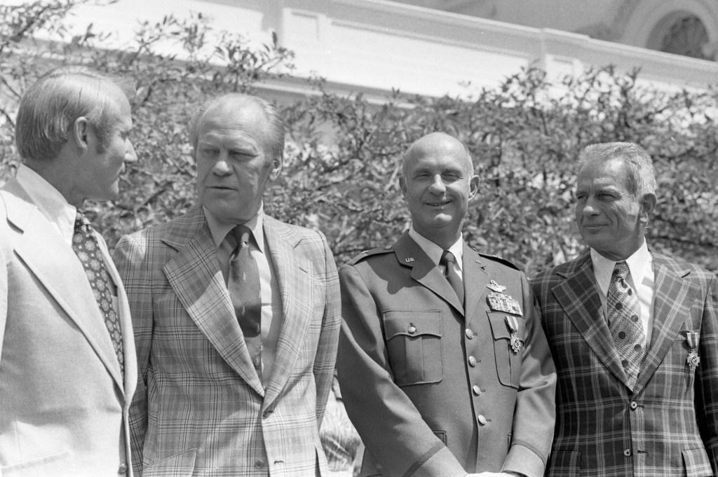 President Ford paid homage today to the last Apollo astronauts, and consulted with his advisers on economic, energy and national security matters. But there were no cheers, no backward glances on the first anniversary of his Presidency. One year after Richard M. Nixon bade a tearful farewell, and Gerald R. Ford took office as the 38th President, it was, said Ron Nessen, the White House press secretary, “just another working day.” Only the release of the President’s 36th interview in office, which he granted yesterday to representatives of three national news services, and a small private dinner tonight with the family of Vice President Rockefeller marked the anniversary of the most tumultuous change of government in the nation’s history.