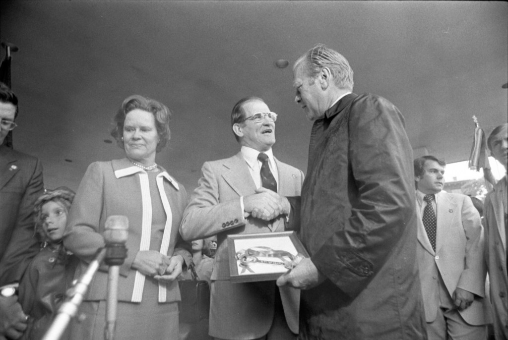 In a speech to a labor union audience in Augusta, Maine, President Ford prodded business and industry to expand production and create new job opportunities to help “maintain the social fabric of America.” Sweeping across New England in a driving rainstorm, the President told a labor union audience in Augusta, Maine, “Labor Day is no holiday for those who are out of work.” He declared that no level of unemployment was acceptable to his Administration and then called, in appearances at political fund‐raising rallies here and in Newport, Rhode Island, for Republican solidarity to enhance the party’s prospects in 1976. “All of us — labor, management and government — must work together if we are to achieve long‐ term economic health,” Mr. Ford told 2,500 participants in a rally in Augusta to raise funds for a children’s hospital. As if to challenge the contention of national labor union leaders that his economic policies were “callous” in tolerating continued high unemployment — the latest national average is 8.4 percent — Mr. Ford took pains to assert that unemployment statistics could never fully reflect the human suffering involved. “There are some losses which are not published,” said. “I refer to the loss of hope among the high school and college graduates seeking their first job, the loss of self‐esteem among the head’s of household who are, laid off, the loss of security and standards of living that people worked for years to achieve and, most important of all, the lops of faith in America’s future.”
