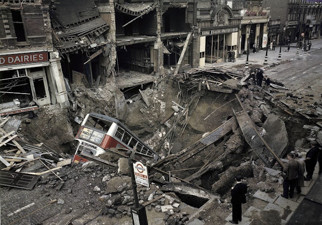 A German bomb exploded on the road above Balham station in south London, creating a large crater which a double-decker bus drove into during blackout conditions. A total of 66 people were killed and pictures of the bus in the crater were published around the world.