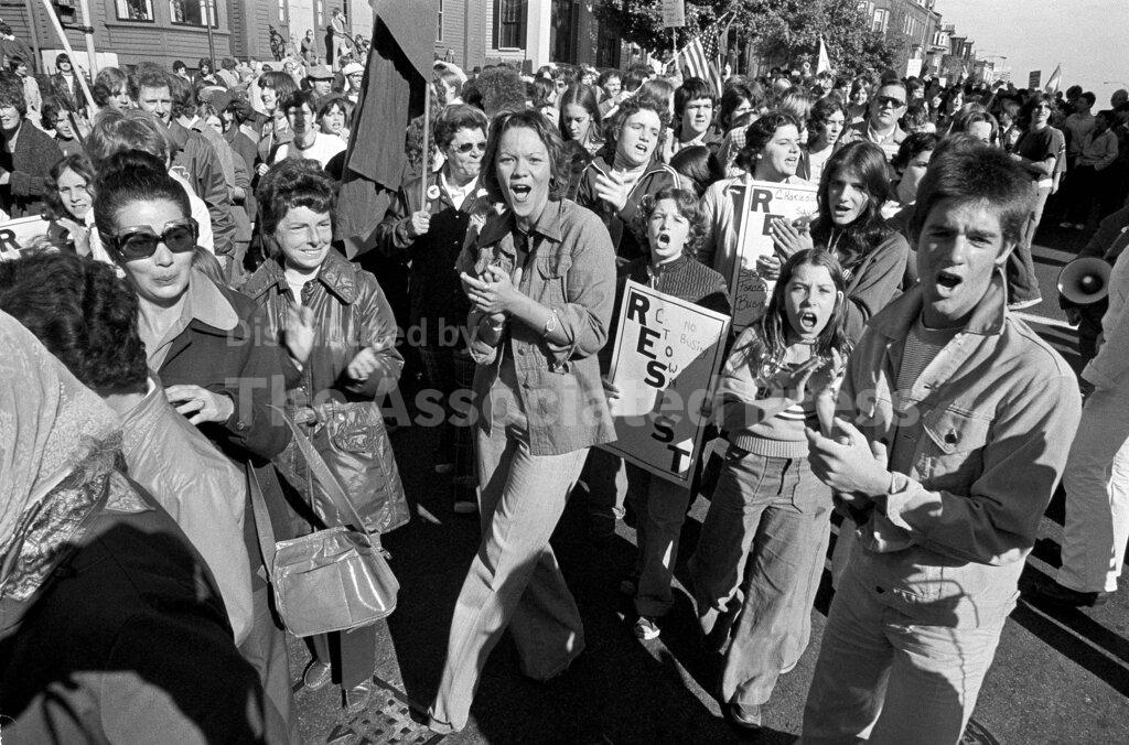 Thousands of white demonstrators marched through the main streets of South Boston today to protest court-ordered busing for school desegregation. A school boycott called as part of what was termed a national day of protest against busing cut classroom attendance sharply in the white ethnic enclave of South Boston and Charlestown, but did not appear to have a major impact on other sections of the city. The area was saturated with policemen from three departments, concerned because Friday was marked by racial fighting in South Boston and a white demonstration and black walkout in Charlestown.