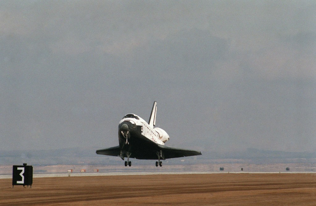 The NASA space shuttle Atlantis landed safely at Edwards Air Force Base in California after a weeklong mission that included the first construction job in space and three successful satellite launchings. After puncturing the air over Los Angeles with a trail of double sonic booms, the Atlantis glided up to the Mojave Desert, made a 170-degree left turn and landed on the large concrete runway here. It rolled to a stop at 1:33 PM, Pacific standard time. “Welcome home, Atlantis — great landing,” Mission Control told the seven crew members, led by the mission commander, Lieutenant Colonel Brewster H. Shaw Jr. Shuttles usually land on endless dirt runways at the base. But a week of rain left scattered puddles on the usually dry lake bed runways. Remnants of rain clouds and wispy mare’s tails filled the sky as the Atlantis returned to the Earth, seven days and 2.8 million miles after its blazing nighttime liftoff from Cape Canaveral, Florida.