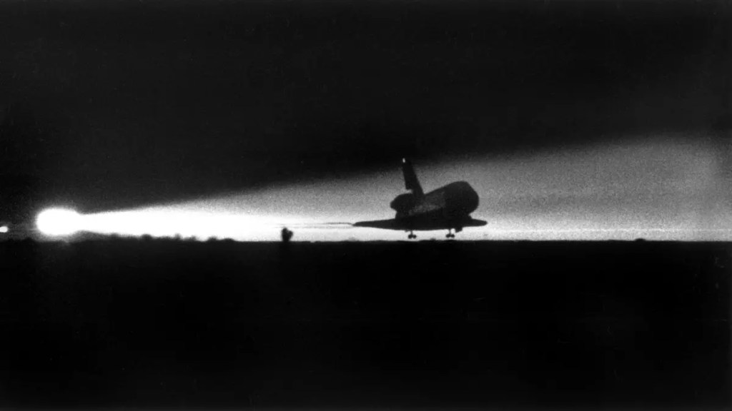 Space shuttle Columbia returned from its STS-61-C mission in space, which began a week ago today. Because of continuing bad weather, its landing was switched from Florida to Edwards Air Force Base. Guided by powerful floodlights, with the hint of dawn on a desert horizon, the space shuttle Columbia landed safely at Edwards Air Force Base today at 5:59 AM, Pacific standard time. The crew of seven astronauts had hoped to land in Florida, but they could not do so when the weather there took another turn for the worse after a landing was twice postponed. The mission began last Sunday. Landing conditions on the dry lake bed at the space agency’s facility here were perfect. The desert was illuminated by six floodlights that gave out an estimated 4.8 trillion candlepower as the spaceship landed under a starry sky.