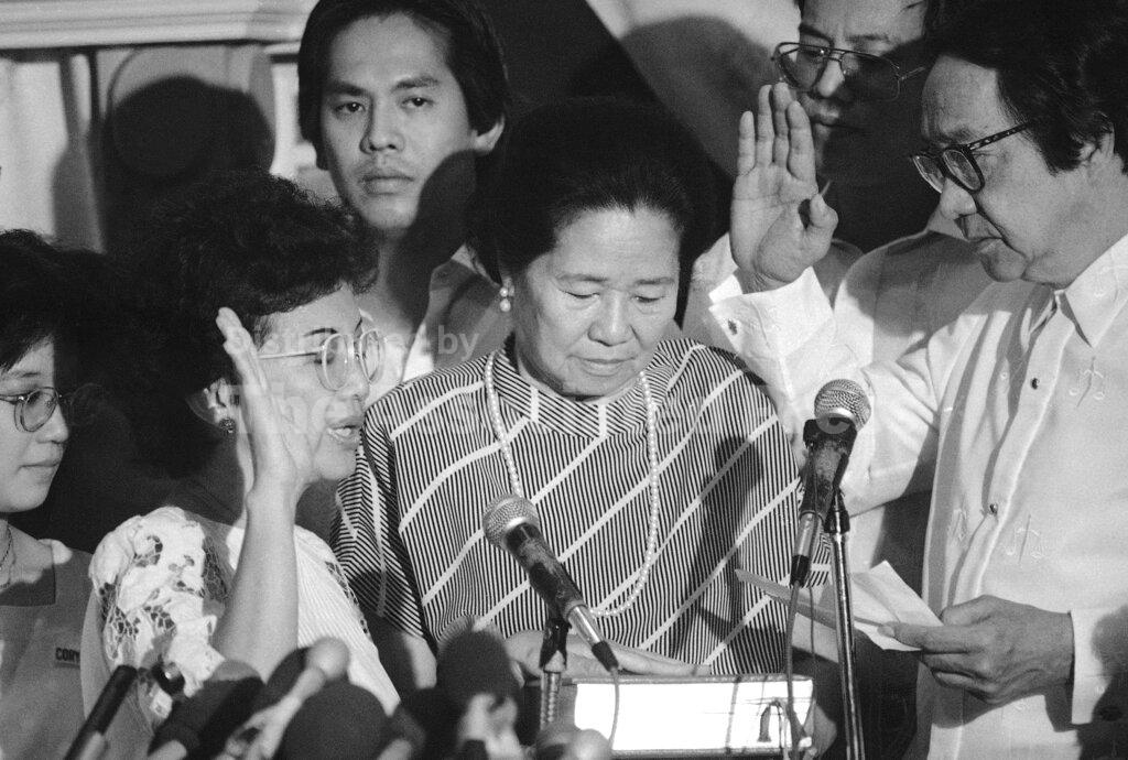 Later in the morning, Corazon Aquino was inaugurated as President of the Philippines in a simple ceremony at Club Filipino in Greenhills, San Juan, about a kilometer from Camp Crame. She was sworn in as president by Senior Associate Justice Claudio Teehankee, and Laurel as vice-president by Justice Vicente Abad Santos. The Bible on which Aquino swore her oath was held by her mother-in-law Aurora Aquino, the mother of Ninoy Aquino. Attending the ceremonies were Ramos, who was then promoted to General, Enrile, and many politicians. Outside Club Filipino, all the way to EDSA, hundreds of people cheered and celebrated. Bayan Ko (My Country, a popular folk song and the unofficial National Anthem of protest) was sung after Aquino’s oath-taking. Many people wore yellow, the color of Aquino’s presidential campaign.