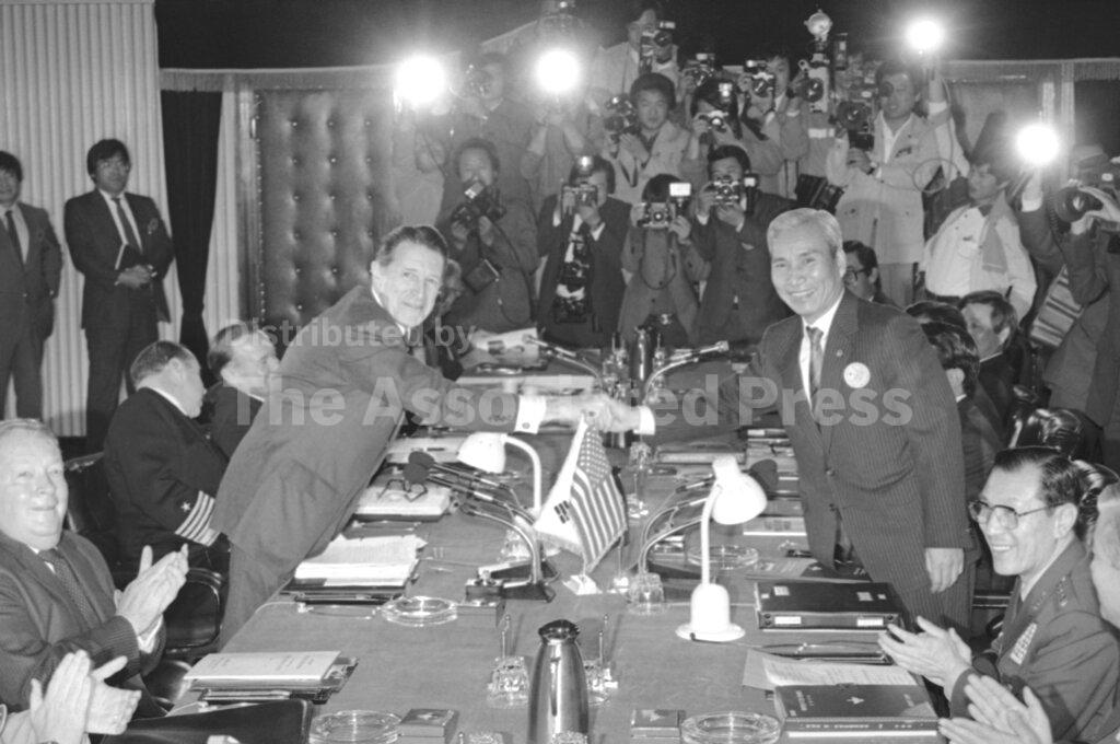 President Reagan places a call to Prime Minister Shimon Peres of the State of Israel. According to Israeli and American officials, Mr. Peres has been privately urging that the United States and other major industrialized nations finance a $20 billion to $30 billion development fund, which he calls a “Marshall Plan” for the Middle East. The plan, he has said, would help Arab countries hit hard by the sharp drop in oil prices, and would encourage economic cooperation within the region at a time when political efforts for peace have foundered.